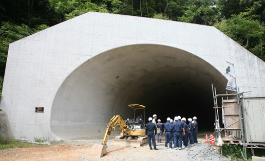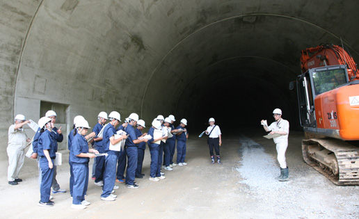 次に訪れた角力場トンネルでは、コンクリート覆工が施された約500mのトンネル内部を歩きながら、工法やトンネル断面の特徴などを学びました。