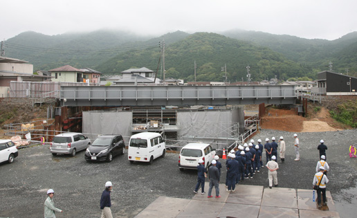 見学中にもJR山口線の列車が仮橋の上を数回通過し、生徒たちは交通を止めずに安全に工事を進めることの難しさや大切さを実感している様子でした。