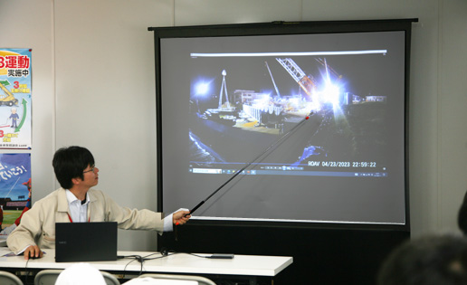 その後、防府土木建築事務所やJR西日本の担当者から工事概要や施工の流れなどの説明を受講。中でも、仮橋架設の際の工事動画では、一晩で旧橋を撤去し仮橋を架設するダイナミックな作業が映し出され、生徒たちは熱心に見入っていました。