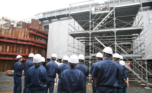 続いて、実際のボックスカルバート工事が進む立体交差部の現場へ移動し、工事の進捗状況や施工方法、安全対策について、担当者の案内のもと詳しく学びました。